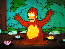In "The Call of the Simpsons," a near-nude Homer is lost in the wilderness. After bees sting him inside his mouth and he falls into mud, a random photographer in the area mistakes him and his inarticulate roars for Bigfoot. The forest quickly becomes a carnival of souvenir stands, burger shacks, and cardboard cutouts advertising "Get Your Picture Taken with Bigfoot." Homer is eventually hunted down, tranquilized, and taken to a lab for testing. Upon observation, scientists are unsure if Homer really is Bigfoot, or merely sub-human. A TV news anchor reports that the photographer "was most impressed by the creature's uncivilized look, its foul language, and most of all, its indescribable stench." After a reporter interviews Marge, a tabloid runs articles with the screaming headlines: "I Married Bigfoot," "Bigfoot's Wife Pleads: 'Call Him Homer,'" and "The Bigfoot Diet: 'Pork Chops Aplenty.'"![]()