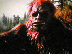 A TV documentary hosted by elderly Clu Gulager, including interviews with a psychic, anthropologists, a taxidermist and the usual witnesses and skeptics. It also covers a Bigfoot festival in Fouke, Arkansas, and shows scenes from The Creature from Black Lake. Among other clips are reenactments of Bigfoot bothering a family eating dinner and watching TV, Bigfoot stealing fruit, and Bigfoot attacking a teenage couple making out in a steamed-up parked car. Most memorable is graphic footage of Bigfoot's skeletal remains, with flesh rotting off the bone.![]()